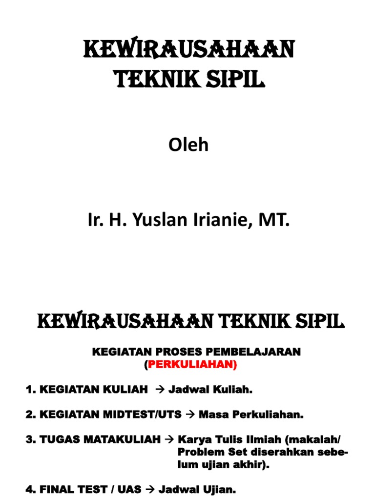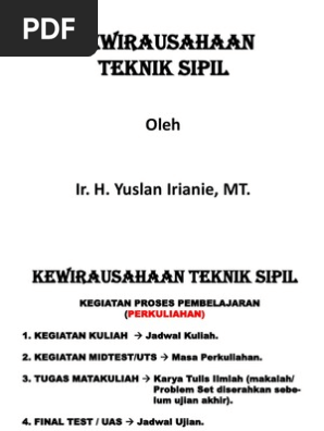 Wirausaha bidang teknik sipil Bentuk non-test. Estimasi Manajemen Risiko Administrasi Kontrak Konsiliasi Mediasi Arbitrasi Material Engineering. Mata Kuliah Kewirausahaan merupakan pelajaran yang membentuk karakter wirausaha atau minimal mahasiswa menambah pengetahuan mahasiswa mengenai seluk-beluk bisnis baik dari sisi soft skill maupun hard skill sehingga mahasiswa mampu memanfaatkan peluang-.
