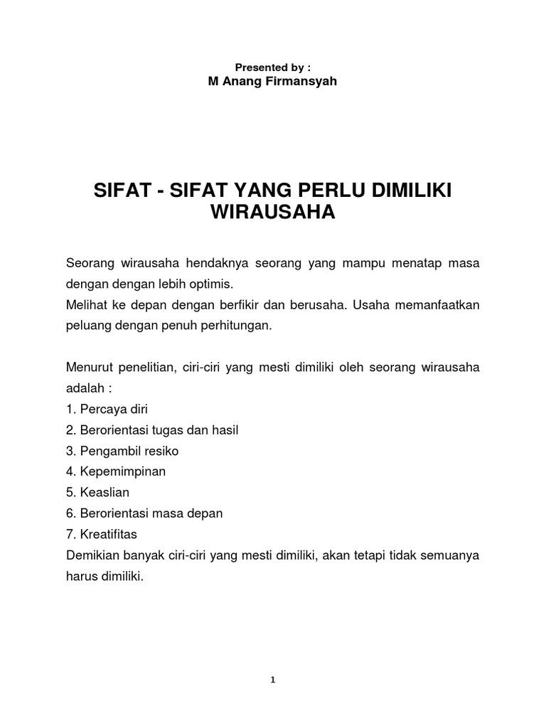 Sifat sifat yang harus dimiliki dalam kewirausahaan. Pengertian wirausaha menurut Kamus Besar Bahasa Indonesia adalah orang. ISifat dasar dan arti penting Kewirausahaan Sejarah Kewirausahaan.