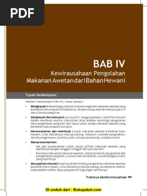 Check Pages 1 - 21 of Bab 4 Kewirausahaan Pengolahan Makanan Awetan dari Bahan Hewani in the flip PDF version. Mengenal Produk Pengawetan Bahan Nabati dan Hewani. Bab 4 Pengolahan Dan Wirausaha Pengawetan Bahan Nabati Dan Sumber.
