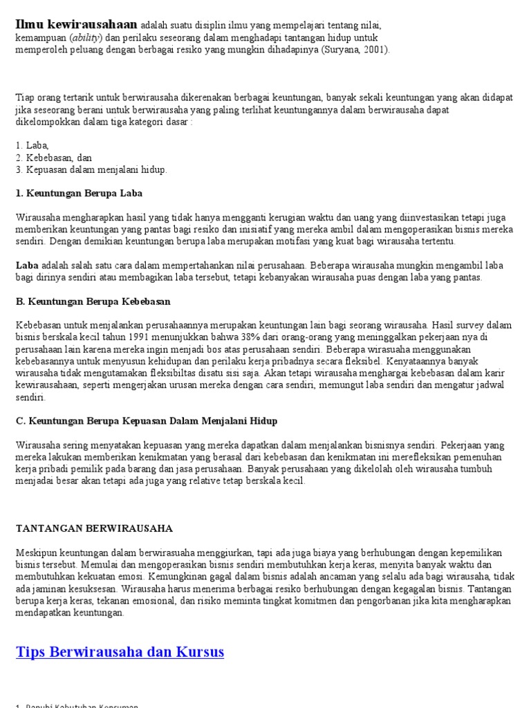Ilmu kewirausahaan adalah suatu disiplin ilmu yang mempelajari tentang nilai kemampuan ability dan perilaku seseorang dalam menghadapi tantangan hidup untuk memperoleh peluang dengan berbagai risiko yang mungkin dihadapinya Suryana 2001. Dalam konteks bisnis menurut Thomas W. Ilmu kewirausahaan merupakan suatu disiplin ilmu yang mempelajari tentang nilai kemampuan ability dan perilaku seseorang dalam menghadapi tantangan hidup untuk memperoleh peluang dengan berbagai resiko yang mungkin dihadapinya.